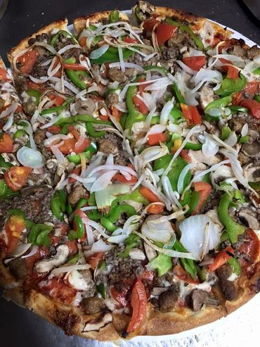 Tomatoes, onion, peppers, spinach, jalapeno, Blk olives, feta, mushrooms, pineapple, eggplant, hamburg, pepperoni, ham, sausage, bacon, chicken (bbq, buffalo) anchovies. Specialty toppings ( steak, artichokes)